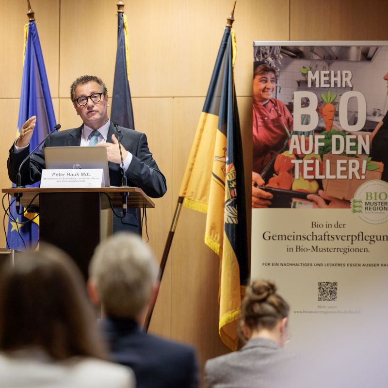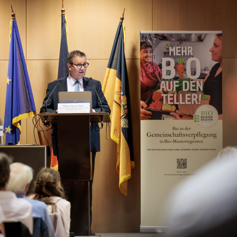 Bei der feierlichen Abschlussveranstaltung des Projekts „Bio in der Gemeinschaftsverpflegung in Bio-Musterregionen“ am 26. Oktober 2022 in Stuttgart lobte Minister Peter Hauk MdL das Engagement der Projektteilnehmerinnen und Projektteilnehmer für eine ausgewogene und nachhaltige Verpflegung.