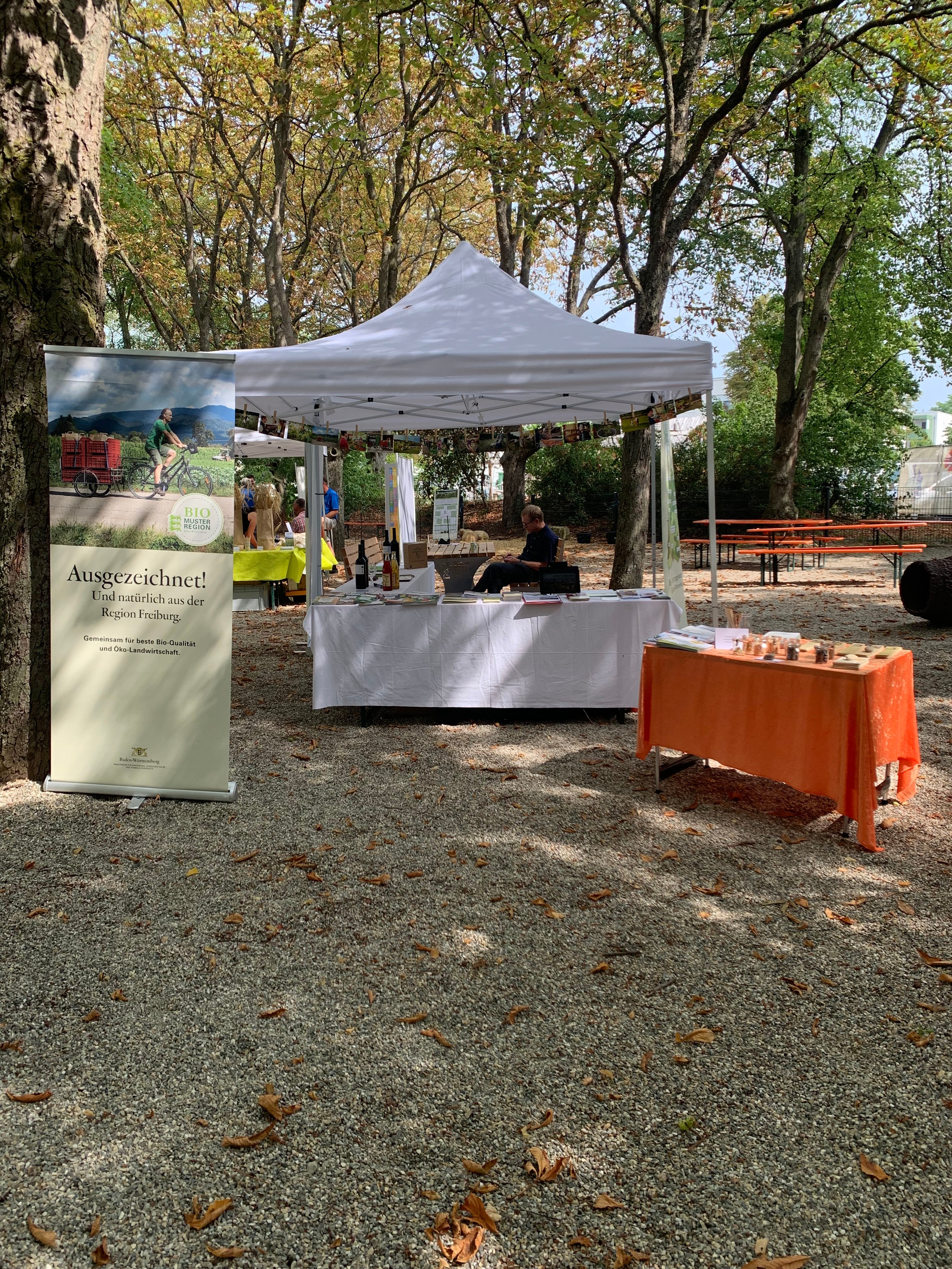 Am 23. Juli durfte sich die Bio-Musterregion Freiburg erneut auf der Landesgartenschau in Neuenburg präsentieren. Die idyllische Lage unter Kastanienbäumen und nahe eines kleinen Sees lud die Besucher:innen zum Verweilen ein. Bei einem kühlen Glas Piwi-Wein konnten sie sich über die Bio-Musterregion und ihre Projekte informieren. Besonders beliebt waren auch dieses Mal das „Teste Dein Wissen“-Quiz zum Thema regionale Hülsenfrüchte und die Rezept-Lesezeichen zum Nachkochen. (Hier finden Sie die Lesezeichen-Rezepte als pdf zum Download). Bei der Weinverkostung wurde die Bio-Musterregion durch ein fachkundiges Team des Weingut Zähringer unterstützt, welches alle Fragen zum Thema "Weinbau der Zukunft" beantworten und über Potenzial, sowie Herausforderungen der pilzwiderstandsfähigen Rebsorten informierten.