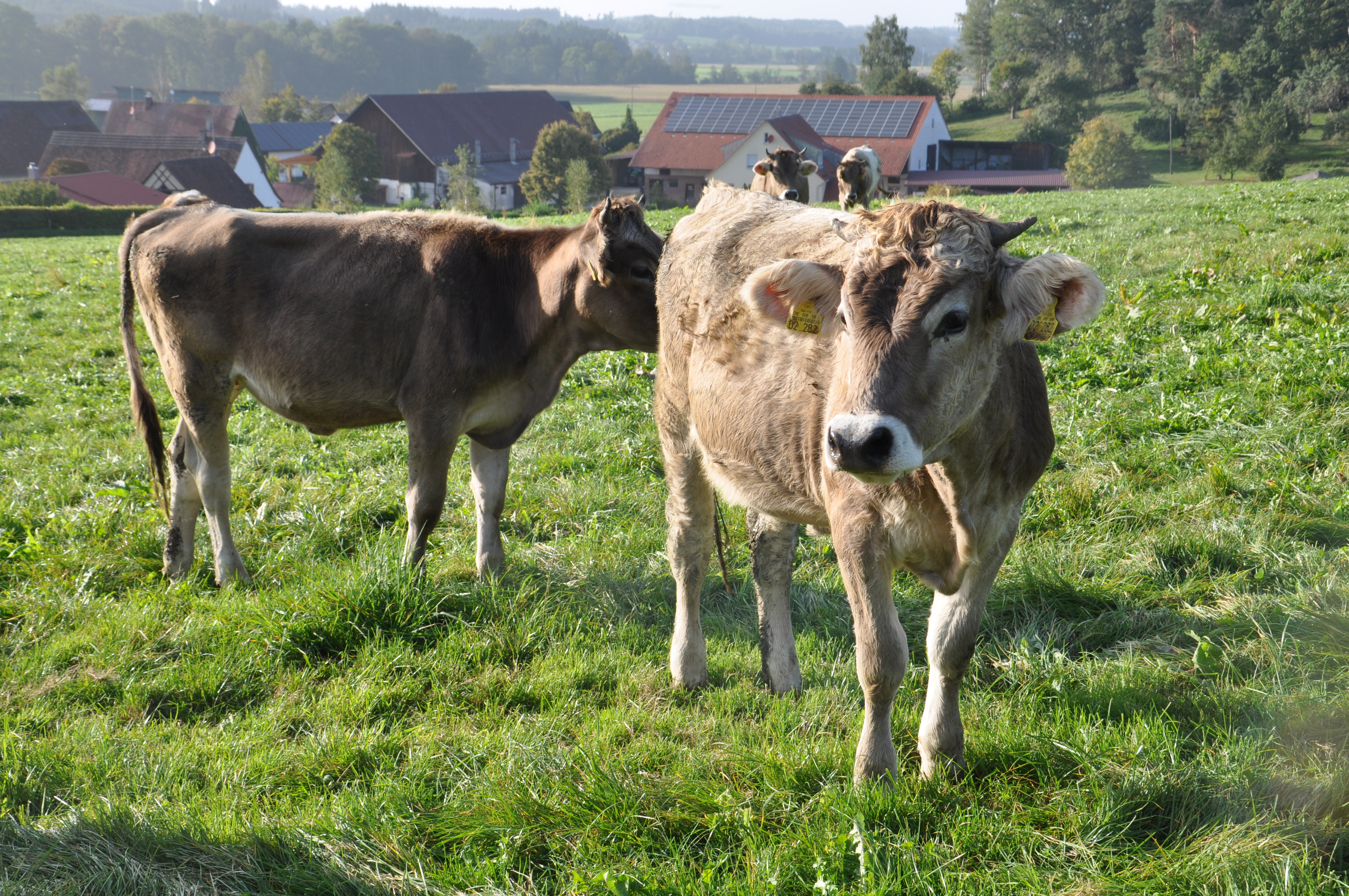 Am Sonntag stand zunächst die Besichtigung des Bauernhof Schads in Englisweiler auf dem Programm. Auf diesem Betrieb, der nach Naturland-Kriterien bewirtschaftet wird, werden neben Mutterkühen und Legehennen auch Bruderhähne gehalten. Die Rinder werden als Bullen oder Kälber geschlachtet und teilweise zu hundertprozentiger Rindersalami verarbeitet. Die Eier und das Fleisch der Bruderhähne werden auch zu Nudeln, Maultaschen oder auch Eierlikör verarbeitet. Alle Erzeugnisse werden vorrangig direkt über den Hof oder auf dem Markt verkauft.