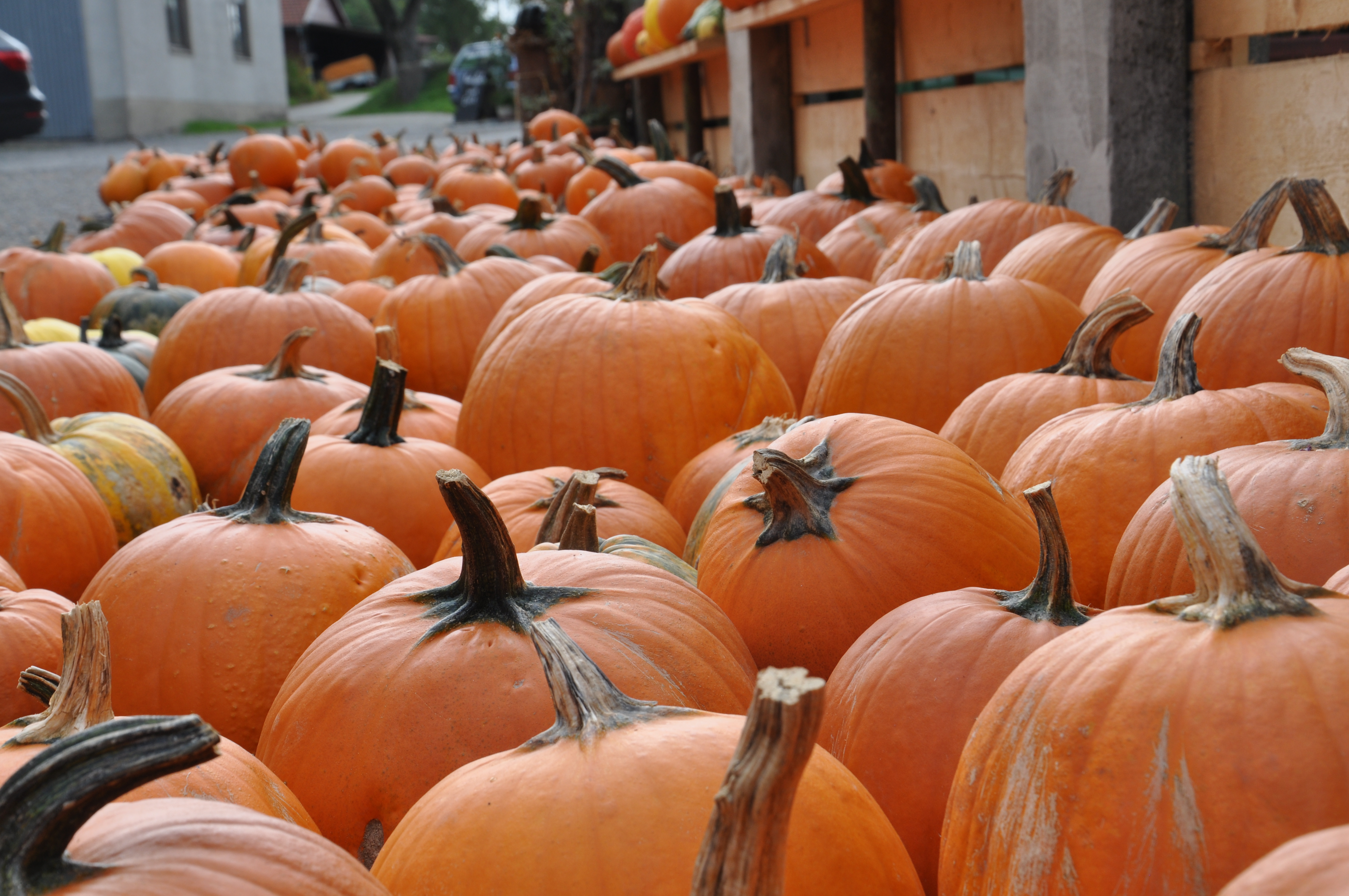 Am Samstag startete der Tag mit der Fahrt durch das Umlachtal nach Ampfelbronn zum Kürbissparadies Spieler - ein konventioneller Betrieb, der sich auf Limousinzucht spezialisiert hat und dabei auch noch einen Hektar unterschiedlichster Kürbisse anbaut. Insgesamt werden bis zu 120 verschiedene Sorten angebaut; der größte Teil sind Speisekürbisse zum Verzehr, aber es gibt auch Zierkürbisse.