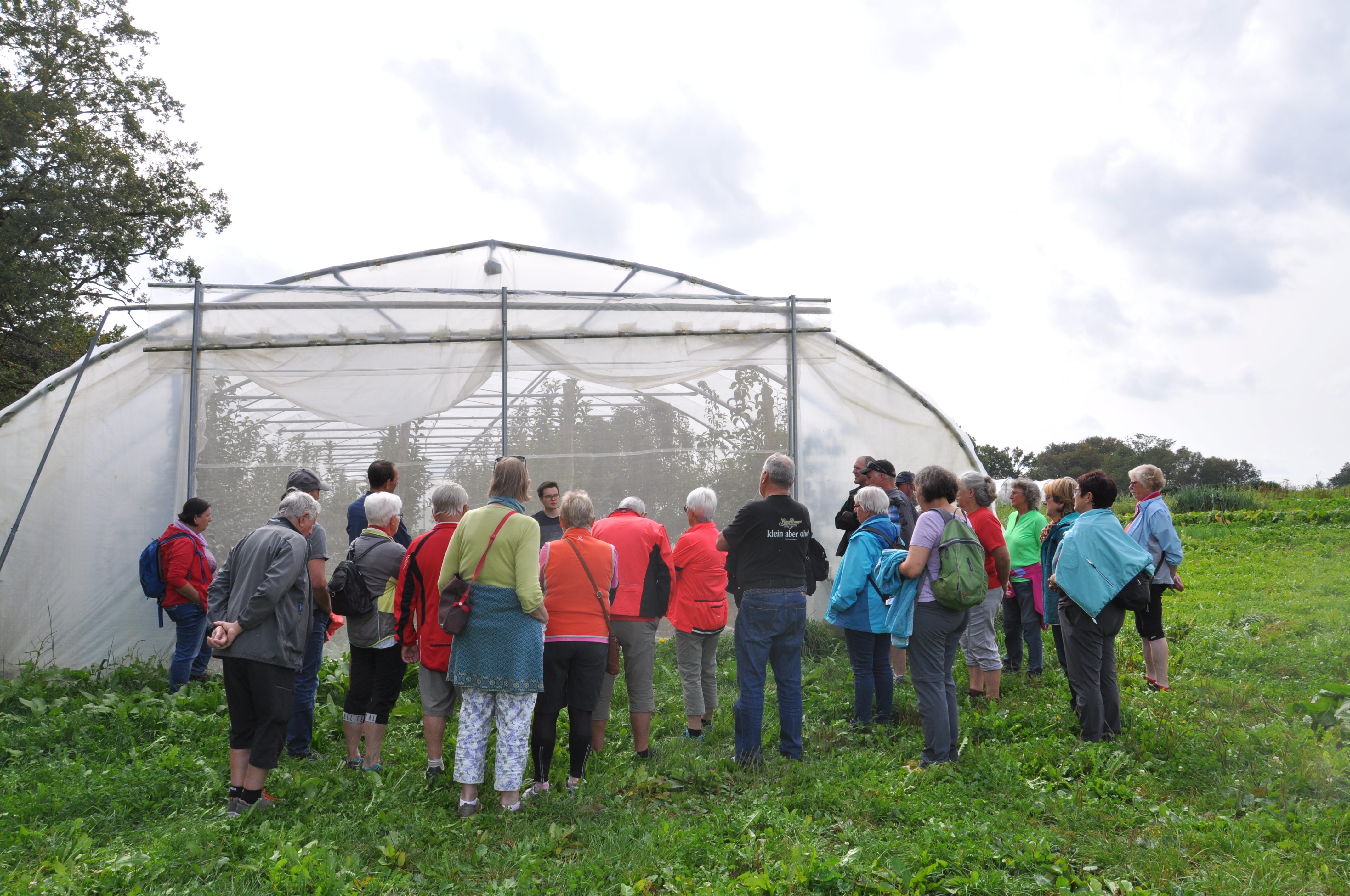 Nach der Weiterfahrt durch das hügelige Gelände Oberschwabens und der Mittagspause am Holzweiher erreichte die Truppe nachmittags den Biohof Miller, der ursprünglich ein klassischer Milchviehbetrieb war. Hofnachfolger Felix Miller hatte schon in der Jugend ein Faible für Obst und Gemüse und schon während des Studiums begann er nach und nach mit dem Anbau von Gemüse nach dem Market Gardening-Prinzip. Dazu kommt der Obstanbau im Folientunnel, was nahezu weltweit eine Neuheit ist. Im Tunnel sieht der junge Landwirt die größten Chancen den Schädlingsdruck in Griff zu bekommen. Inzwischen werden in den zehn beeindruckenden Folientunnel nicht nur Äpfel und Birnen, sondern auch viele exotische Früchte wie Pfirsiche, Aprikosen, Physalis und vieles mehr angebaut. Für alle sehr beeindruckend war, dass auf dem Biokreis-Hof mehr als 150 verschiedene Sorten an Tafeltrauben angebaut werden.