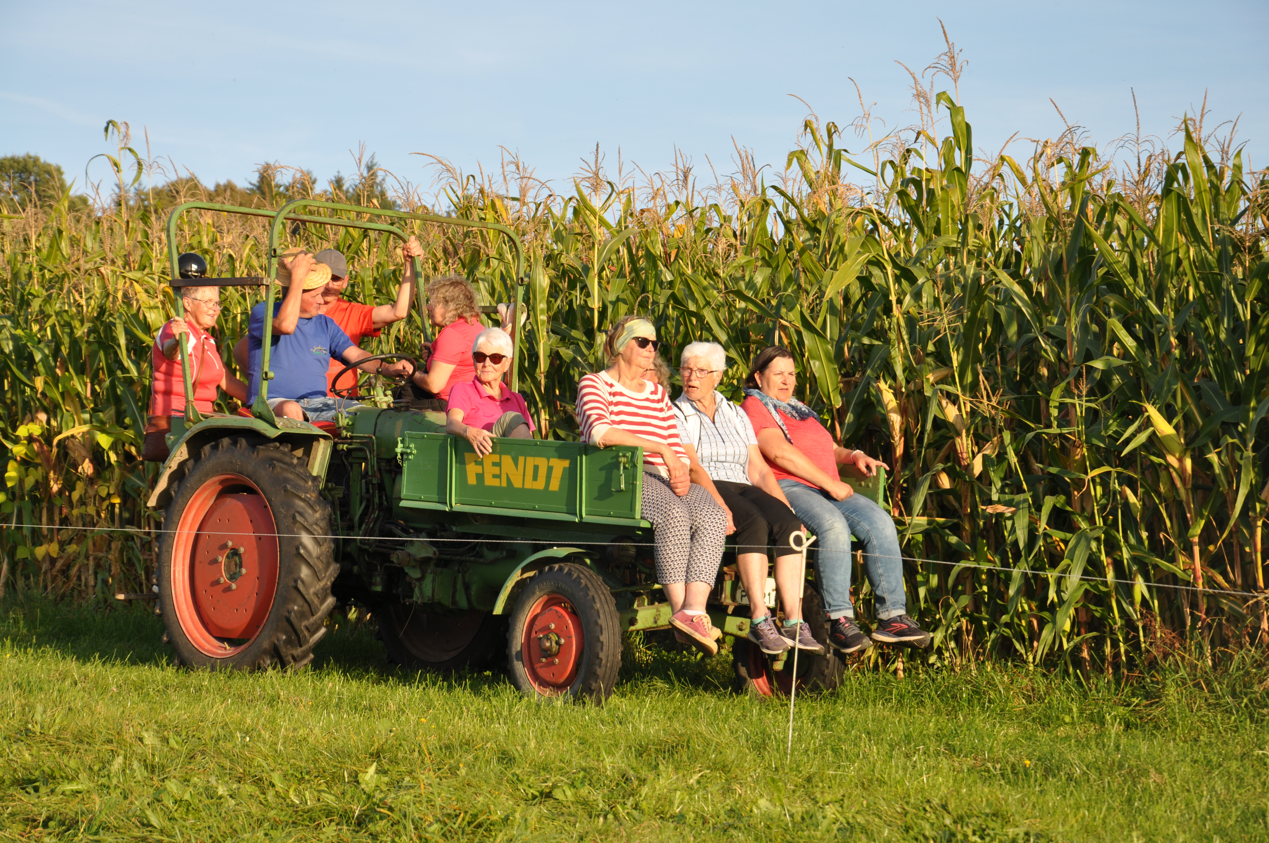 Nach einer Führung in der Bergkapelle Erolzheim und anschließender Mittagsrast mit Kaffee und Kuchen ging es weiter entlang der Iller gen Norden nach Gutenzell-Hürbel auf den Wendelhof, der von zwei Groß-Cousins als GbR nach Bioland-Richtlinien bewirtschaftet wird. Nach einem Einstieg über die grundsätzliche Frage, wie die Landwirtschaft der Zukunft aussehen könnte, zeigte Landwirt Huchler der Gruppe, die er zum Teil mit auf seinen Fendt nahm, einige Flächen, mit denen er dem Klimawandel entgegenwirken will. Zum einen hat er Agroforstflächen angelegt. Dabei werden an Weidezäunen, aber auch streifenweise in größeren Ackerflächen Werthölzer wie Walnuss, Schwarznuss und Kirsche gepflanzt. Zwischen niedriger wachsenden Kulturen wie z.B. Mais, bringt das Vorteile wie Schutz vor Erosion und bessere Wasserspeicherung. Zudem wurde die Wichtigkeit der Kuhfladen auf den Weiden hervorgehoben, da diese einen prächtigen Lebensraum für Insekten und damit auch für Vögel bieten.