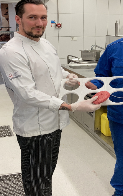 Genau diese Art der Fleischverwertung von ‚nose to tail‘ können die Mitarbeitenden der Liebherr-Hydraulikbagger GmbH in Kirchdorf in der Kantine in ihrer Mittagspause erschmecken. Auf den Tellern der Betriebsgastronomie landet Bio-Rindfleisch aus der Region in verschiedensten Formen. Sie finden dort einen Schmorbraten, der über Nacht mit Niedertemperatur gegart wurde, genauso wie ein Ragout von Herz und Nieren oder gebratene Leberscheiben. Die Knochen vom Rind werden als Soßen- oder Suppenansatz verwendet, das Fett wird ausgelassen und zum Anbraten hergenommen. Natürlich kommt auch Altbekanntes wie Hackfleisch beispielsweise in Form eines Bio-Burgers auf die Speisekarte, die in der eigens von den Azubis aus dem 3D-Drucker gefertigten Form zubereitet werden.