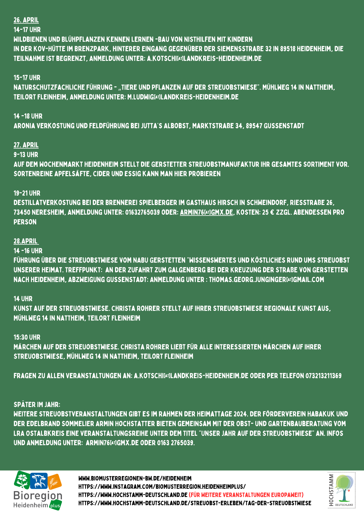 Am 28. April fand eine Führung über die Streuobstwiese vom NABU Gerstetten mit dem Titel „Wissenswertes und Köstliches rund ums Streuobst unserer Heimat“ statt. Am Nachmittag wurde Kunst von Christa Rohrer auf der Streuobstwiese am Mühlweg 14 in Nattheim ausgestellt und Märchen auf der Streuobstwiese vorgelesen.