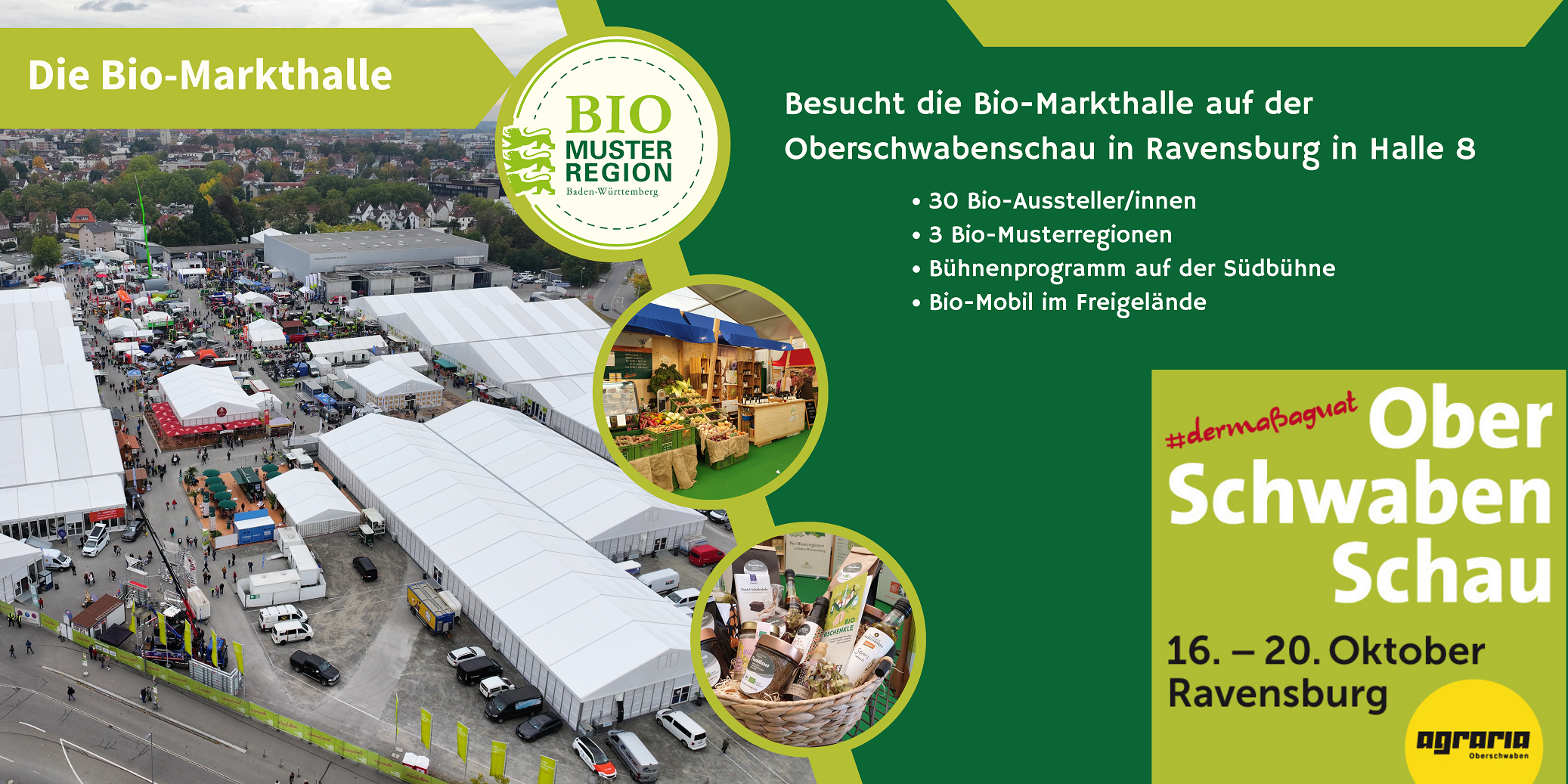 Durch die Zusammenarbeit der drei Bio-Musterregionen Biberach, Bodensee und Ravensburg konnte in Zusammenarbeit mit der Ravensburger Veranstaltungsgesellschaft die neue Halle realisiert werden. Eine weitreichende Förderung ermöglicht es hier auch kleineren Bio-Betrieben aus den drei Regionen sich und ihre Produkte zu präsentieren. In Halle 8 (Bio-Markthalle) werden an diesen fünf Tagen Produkte, Gesichter, Höfe und Betriebe sowie die Themen rund um den ökologischen Landbau in den Fokus gestellt.