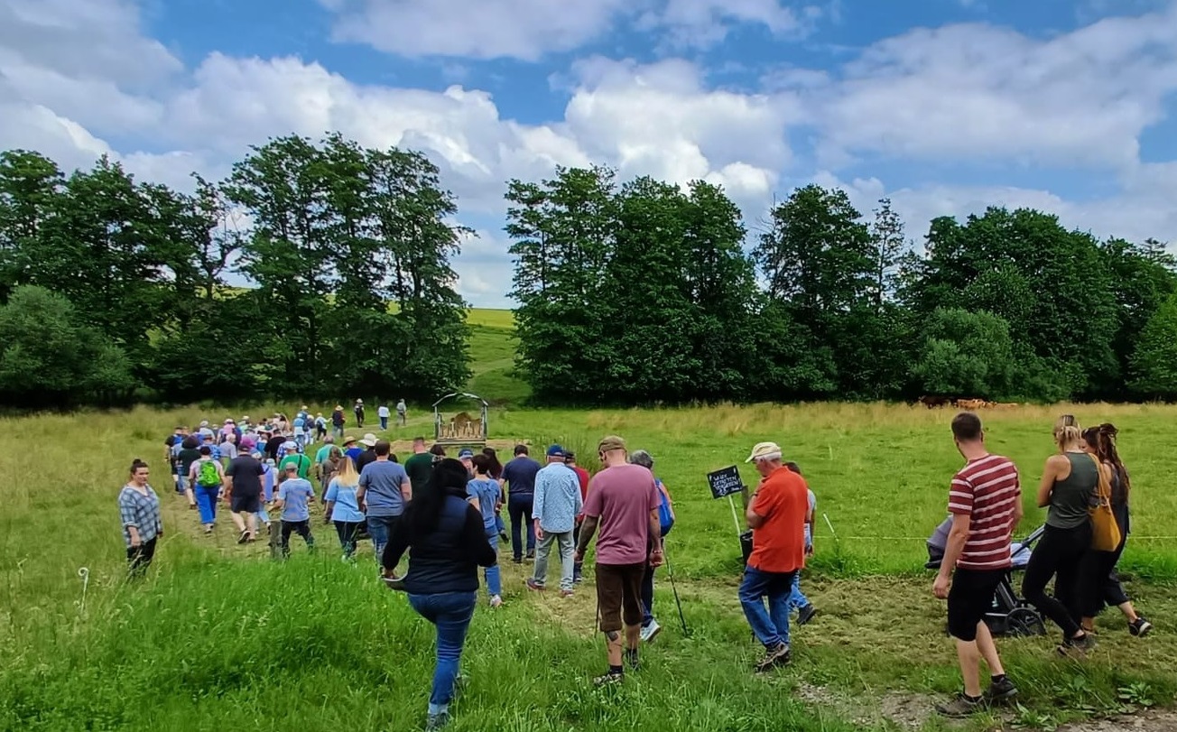 Nach den Informationen auf dem Hof startete die Wanderung, vorbei an der Weide der Mutterkuhherde, entlang Äckern mit Dinkel, Lein und Emmer. „Wir bauen auf unseren Äckern außerdem mehrjähriges Kleegras an. Das Kleegras verdrängt Unkräuter und hilft, die Fruchtbarkeit des Bodens sicherzustellen“, so Fellmann. Ein schonender Umgang mit den Böden sei von großer Bedeutung, damit sie nicht durch Erosionen, Verdichtungen oder einseitige Fruchtfolge an Wertigkeit verlieren.