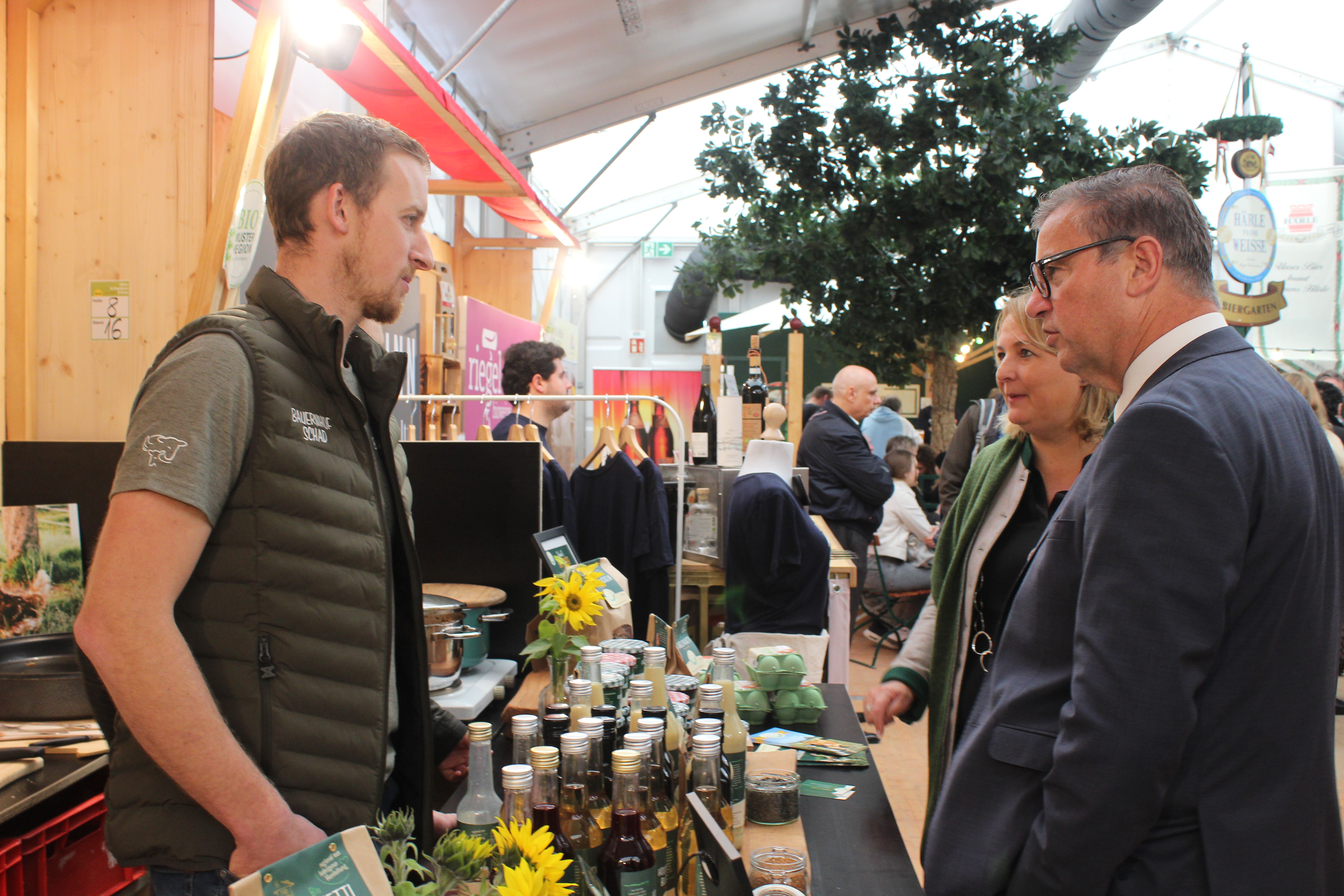 Minister Peter Hauk machte sich am Samstag ein Bild von der Bio-Markthalle und kam mit den Ausstellenden ins Gespräch. Und im Freigelände konnte das Bio-Mobil „Grenzenlos Regional –Bio in Europa“ besucht werden, an dem unter anderem täglich wechselnde Verkostungen regionaler Bio-Produkte stattfanden.