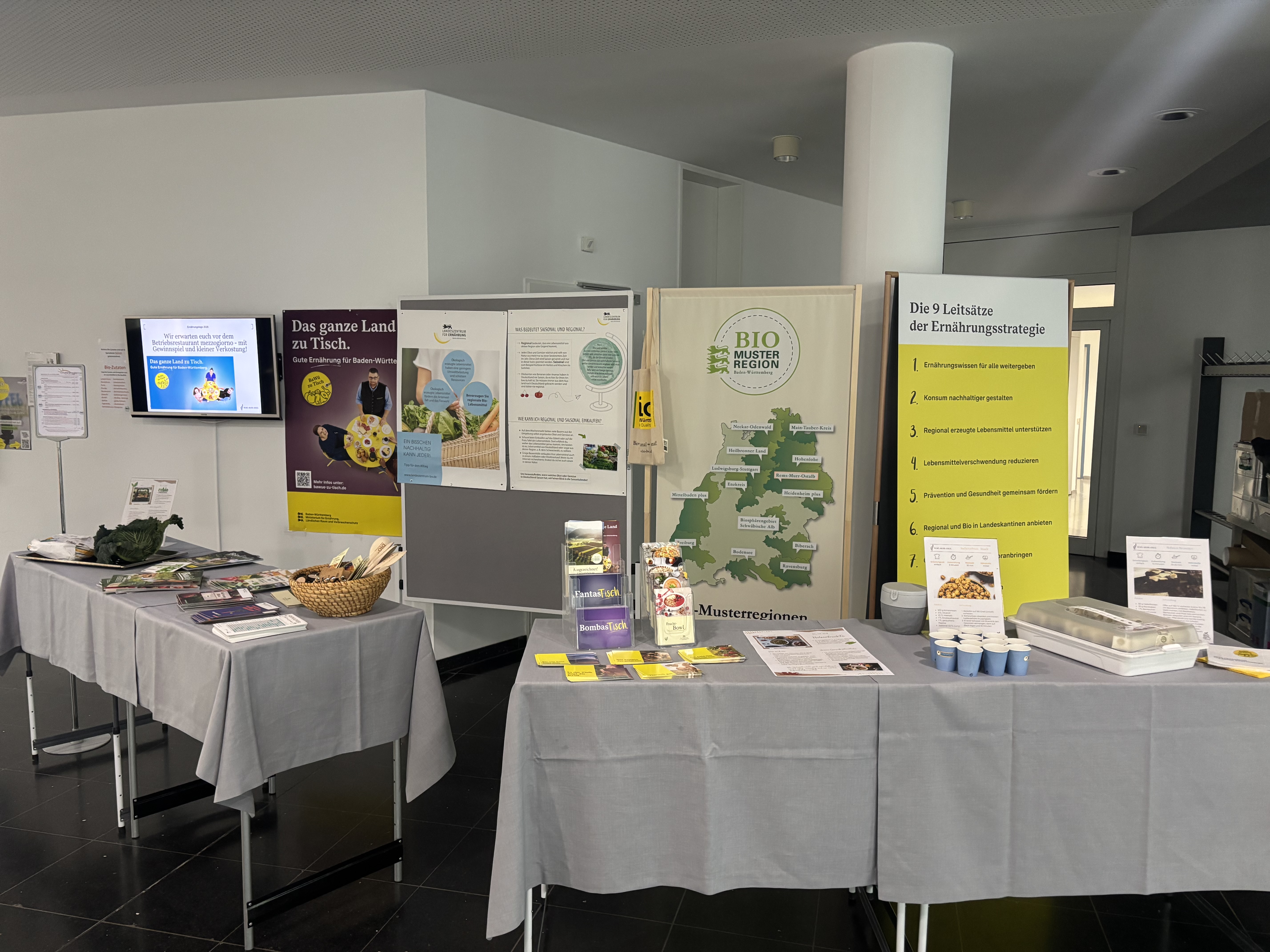 Der aufgebaute Informationsstand der Bio-Musterregion und des Rems-Murr-Kreises vor der Kantine "mezzogiorno" im Landesamt für Besoldung und Versorgung in Fellbach.