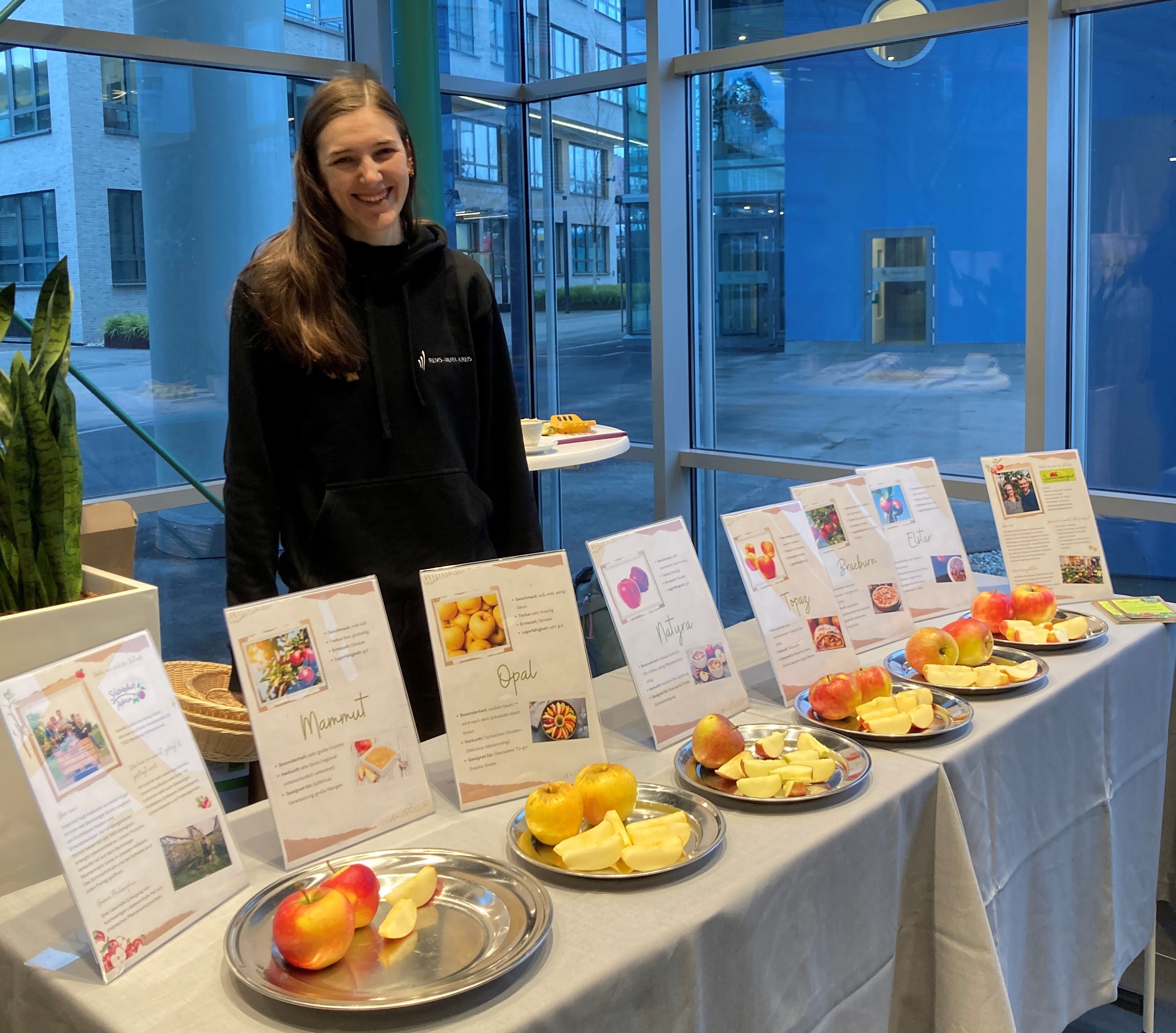 Im Mittelpunkt des Aktionstags stand der Apfel als regionales und saisonales Lebensmittel. An einem Verkostungsstand konnten die Besucher:innen sechs verschiedene Apfelsorten probieren und miteinander vergleichen. Alle angebotenen Äpfel stammten aus ökologischem Anbau im Rems-Murr-Kreis, wurden vom Biolandhof Adrion (Backnang) sowie vom Sonnenberghof (Rohrbronn) bereitgestellt. Die Verkostung ermöglichte einen direkten sensorischen Vergleich der Sorten und machte geschmackliche Unterschiede ebenso wie die Vielfalt regionaler Bio-Äpfel erlebbar.
