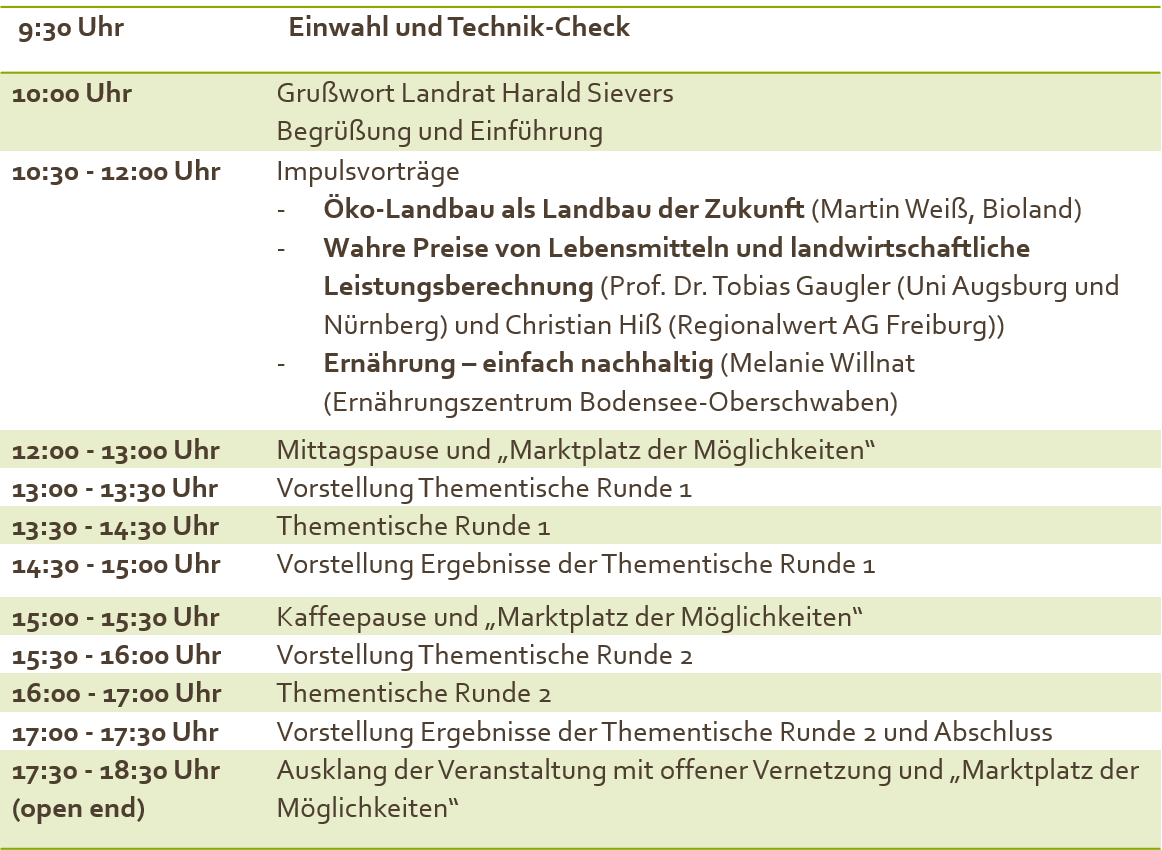 In einer Online-Konferenz stehen am 20. März ab 9:30 Uhr bis ca. 18:00 Uhr unterschiedliche Bereiche rund um das Thema „Bio“ und „Nachhaltigkeit“ im Mittelpunkt: ökologische Landwirtschaft, regionale Wertschöpfungsketten, Klimaschutz sowie eine gesunde Ernährung. Neben Impulsvorträgen zu Beginn der Konferenz sind insbesondere die Thementische ein Herzstück der Mitmach-Konferenz. Hier sollen Projekte der Region, die in dieses Themenspektrum passen, vorgestellt und mit allen Interessierten (Ihnen) weiterentwickelt werden – das Mitmachen und Mitgestalten steht dabei im Vordergrund. Daneben gibt es auf dem „Marktplatz der Möglichkeiten“ in der virtuellen Realität viele regionale Projekte und Initiativen zu entdecken.