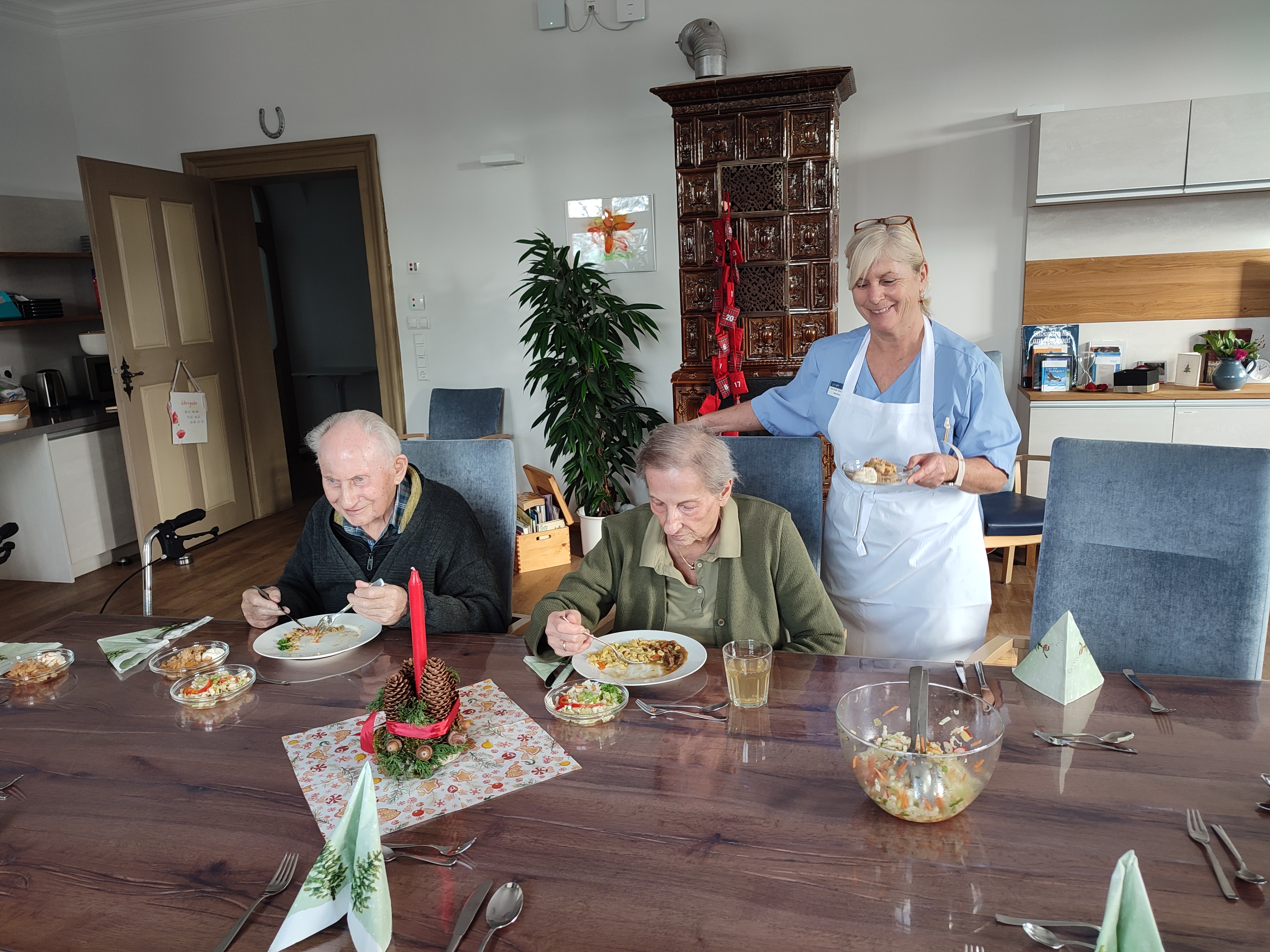 Adventsmenü: Kartoffel-Lauch-Suppe, Möhrengulasch, Spätzle, Salat, gef. Buchweizen-Pfannkuchen und Apfelcrumble