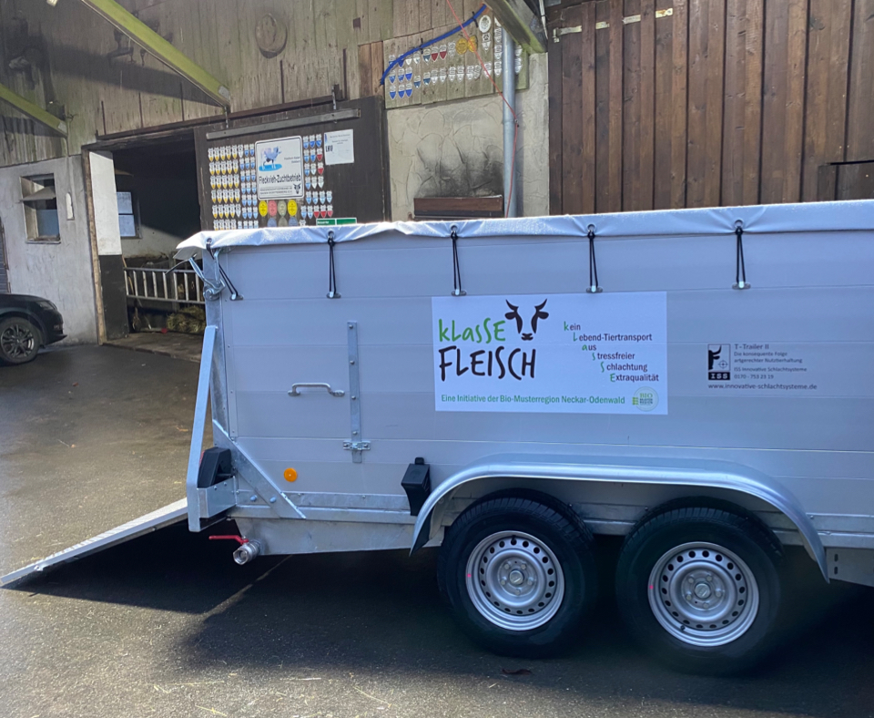 Üblicherweise sind Haltungsbetrieb und Schlachtbetrieb nämlich nicht identisch und die Tiere müssen oft lange Transportwege zum Schlachthof auf sich nehmen. Zumeist ist es die erste Fahrt in einem Anhänger in ihrem Leben. Im Schlachthof müssen die Tiere dann getrennt von ihrem vertrauten Umfeld und Herdenverband vor der Schlachtung warten, bis sie in die Tötungsfalle kommen. Damit dieser unnötige Stress vermieden wird, haben auf Initiative unserer Bio-Musterregion sieben Landwirtinnen und Landwirte eine GbR gegründet und zusammen eine mobile Schlachteinheit angeschafft. Die gleichnamige Gesellschaft „klasse Fleisch“ ist dem Maschinenring Odenwald-Bauland e.V. angegliedert.
