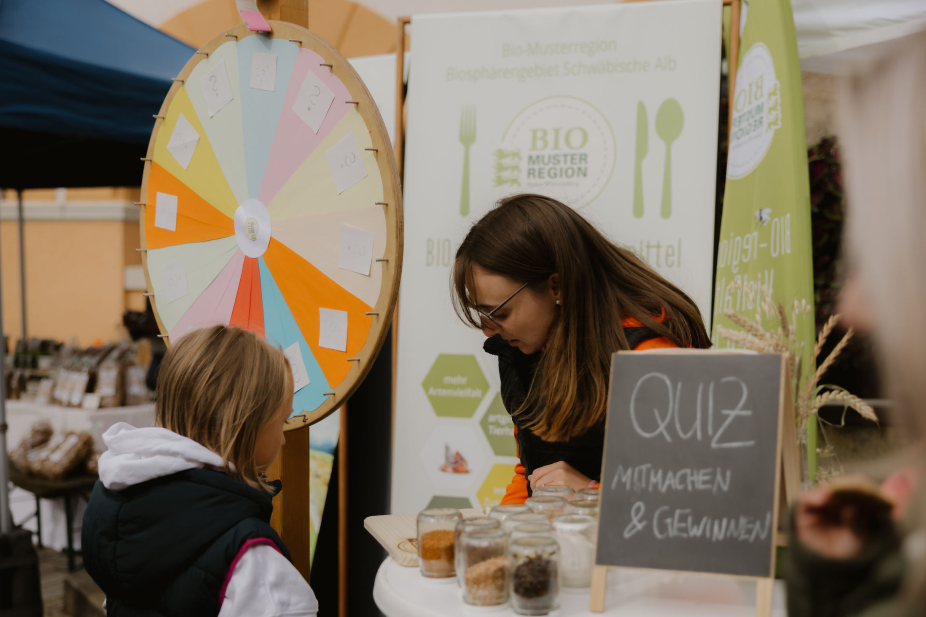 Auch die Bio-Musterregion war gemeinsam mit der Geschäftsstelle Biosphärengebiet Schwäbische Alb mit einem Infostand vor Ort. Wir informierten die Besucherinnen und Besucher über Ökolandbau und nachhaltige Ernährung sowie rund um die Themen des Biosphärengebiets. Bei einem Quiz konnten die Besucherinnen und Besucher ihr Bio-Wissen unter Beweis stellen und Neues dazulernen.