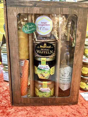 Sorten Bio-Honig, Bio-Honigwein, Honig-Waffeln, Zanger Honigbonbons, Bienenwachs-Kerze aus Eigenproduktion, Honig-Waffeln von