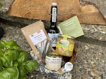 Bündelung regionaler Bioprodukte in verschiedenen thematischen Geschenkkörben entsteht ein Geschenk mit dem jeder ein Zeichen der