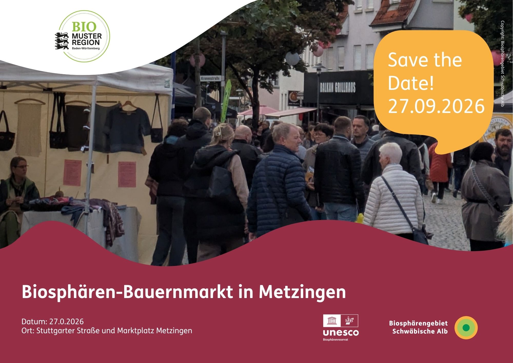 Die Bio-Musterregion und das Biosphärengebiet Schwäbische Alb richten zusammen mit der Metzinger Marketing und Tourismus GmbH zum dritten Mal einen Biosphären-Bauernmarkt aus. Für diesen werden noch weitere Betriebe gesucht, die (Bio-)Produkte aus der Region anbieten. Der Markt findet am 27.09.2026 auf dem Rathausplatz und der Stuttgarter Straße statt.