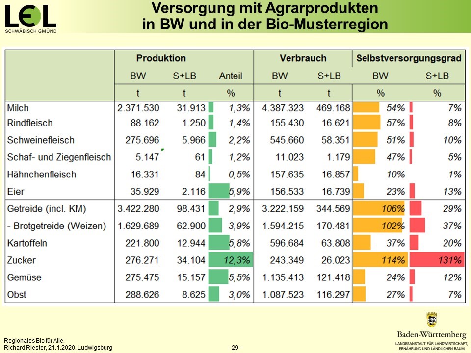 Die Öko-Produktion liegt in der BMR auf einem im Landesvergleich besonders niedrigem Niveau. Das Produktionspotential ist trotz der sehr fruchtbaren, aber knappen Flächen begrenzt: auch bei Ausweitung der Bio-Produktion wird eine Deckung der eigenen Nachfrage aller Lebensmittelgruppen nicht über die eigene Produktion im Land- und Stadtkreis möglich sein. Es gibt einfach zu wenige Landwirte und zu wenig landwirtschaftliche Nutzfläche in der Region, um die rund 1,17 Mio. Verbraucher aus der Region zu ernähren – so lautete die zunächst ernüchternde Bilanz. Der Selbstversorgungsgrad mit tierischen Agrarprodukten liegt einschließlich konventionell erzeugter Produkte in der BMR Ludwigsburg/Stuttgart nur bei 1 bis 13 %. Die Definition von „regional“ muss also über die eigenen Kreisgrenzen hinaus gehen und eher Baden-Württemberg-weit interpretiert werden, schlussfolgerte der Experte von der Landesanstalt.