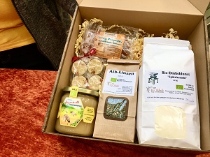 Region: vom Talhof, Biotal, der Härtsfelder Brauerei Hald oder weitere Produkte aus eigener Herstellung. Auch Gutscheine
