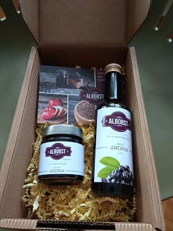 Aronia Gelee und Aronia Sirup mit Flyer in Geschenkkarton verpackt. 12,-€