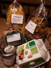 Auf Bestellung bekommt man beim Biohof Vetter in Baienfurt ab ca. 35 € ein Bio-Gschenkle mit Eiern, Käse, Lupinenkaffee, Nudeln und Honig. Mit etwas mehr Budget und auf Wunsch können auch noch Obstbrände dazu gepackt werden. Eine Belieferung ist nicht möglich.