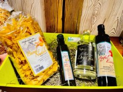 Das BioGschenkle vom Rösslerhof erhalten Sie individuell zusammengestellt zu Ihrem verfügbaren Budget. Enthalten sind hofeigene Bio-Produkte aber auch Produkte, anderere Bio-Erzeuger/innen und Partnerbetrieben. Die Produktpalette reicht von Balsamico-Essig über Nudeln und Honig bis hin zu besonderen Ölen aus Hanf und Lein. Die Gschenkle müssen vorbestellt werden, auf Anfrage ist eine Belieferung im Umkreis bei größerer Stückzahl möglich.