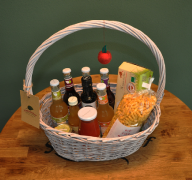 Bestückt mit Getränken von Bier über verschiedene Schorlen bis hin zu feinsten Bio-Weinen vom Bodensee, aber auch Mehl, Öl, Backwaren, Chips, Käse, Duftöle, Äpfel und Linsen bietet dieses Bio-Gschenkle für jeden Geschmack etwas. Auf Bestellung werden die Produkte nach Wunsch zusammengestellt. Erhältlich beim Liebenauer Landleben in Meckenbeuren ab 30 €. Bis zu 80 Stück können auch geliefert werden.